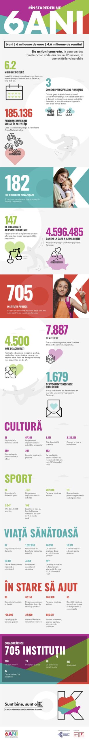 · În Stare de Bine, unul dintre cele mai mari programe de finanțare privată anuală din România, implementat de Fundația pentru Dezvoltarea Societății Civile (FDSC) cu sprijinul Kaufland, sărbătorește 6 ani de existență. În acest timp, programul a oferit granturi nerambursabile în valoare de 6.2 milioane de euro ONG-urilor din România, pentru intervenții în profunzime în comunități vulnerabile;