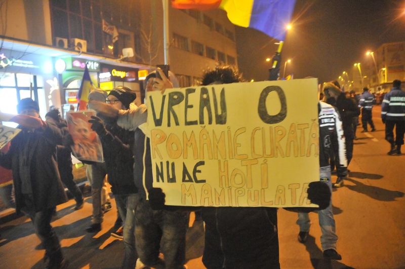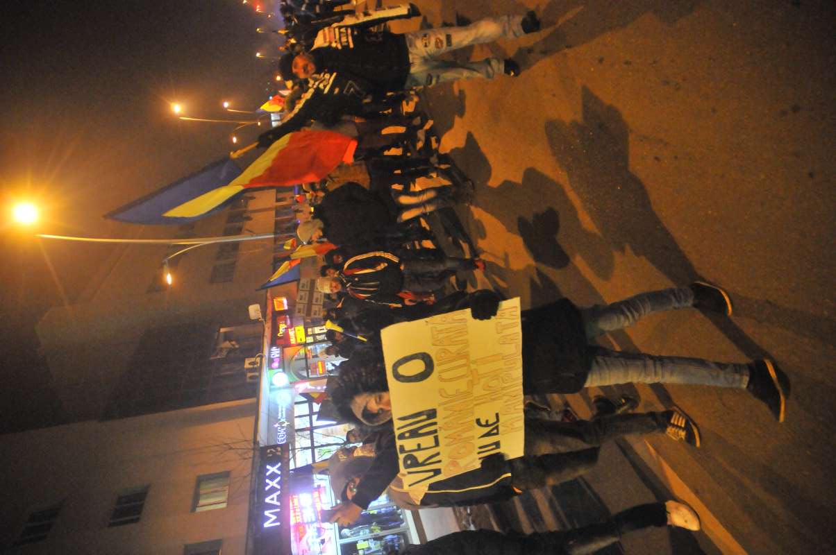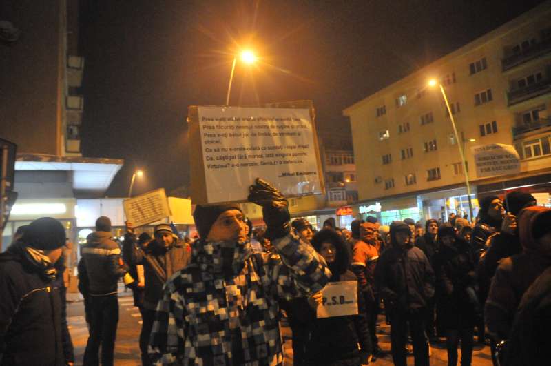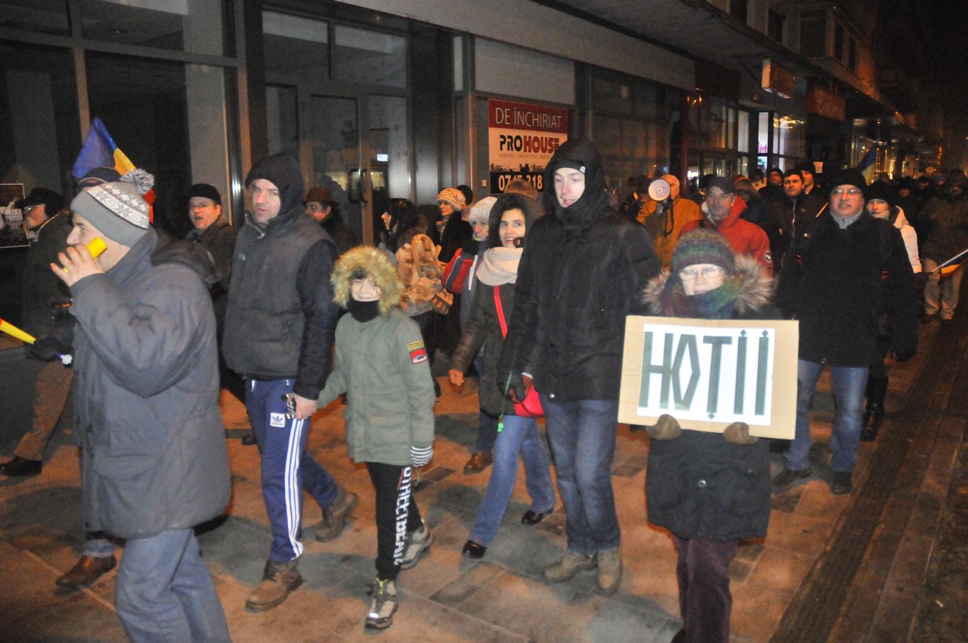 Printre scandări de genul „Ieşiţi din casă/Dacă vă pasă!”, „Vrem o Românie curată, nu de hoţi manipulată!” sau „DNA/Să vină să vă ia!”, o notă aparte o reprezentau trei protestatari care afişau pancarte pe care se puteau citi versuri din poeziile „Scrisoarea III” de Mihai Eminescu şi „Noi vrem pământ!” de George Coşbuc. La un moment dat, ca la o comandă, cei prezenţi în piaţetă s-au pus în mişcare spre clădirea Primăriei.