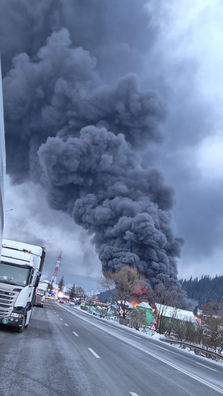Flăcările au cuprins rapid clădirea și anvelopele depozitate, generând un fum dens și negru, vizibil de la kilometri distanță.