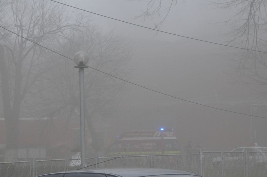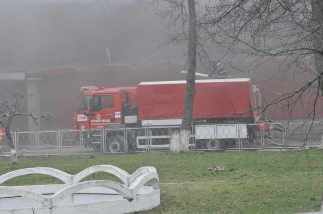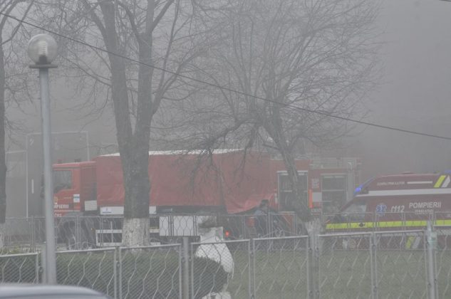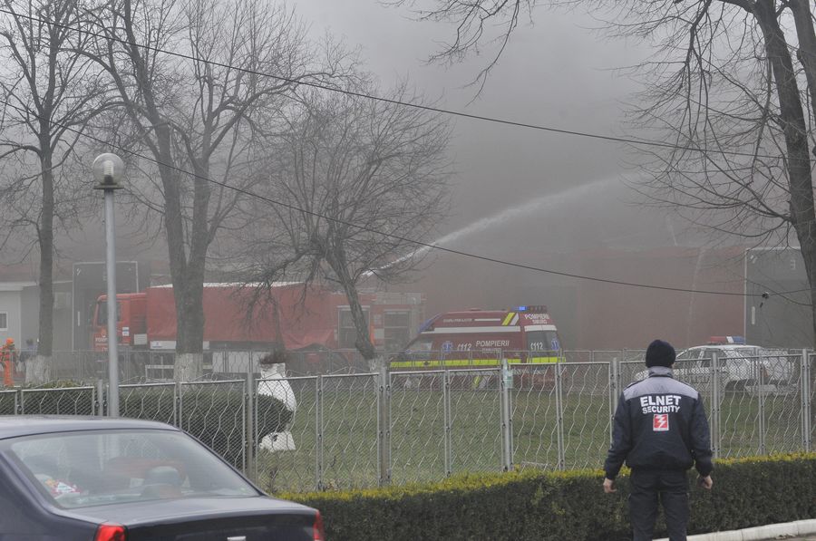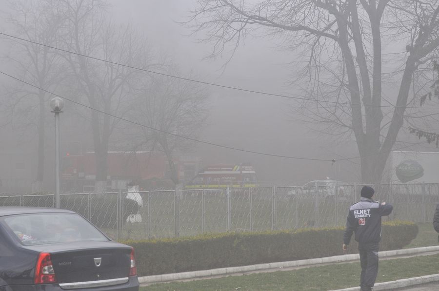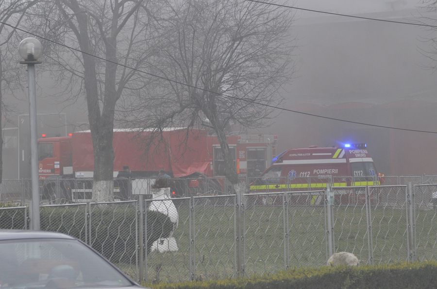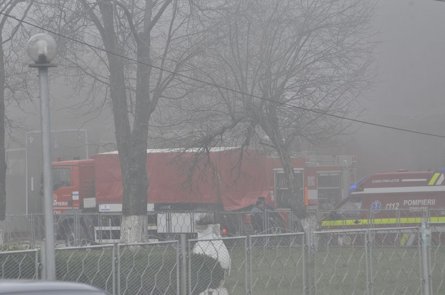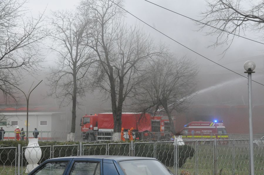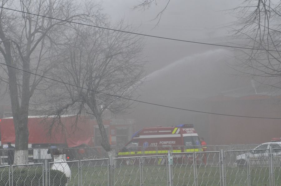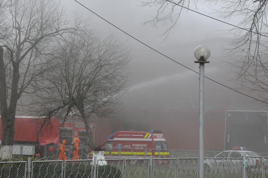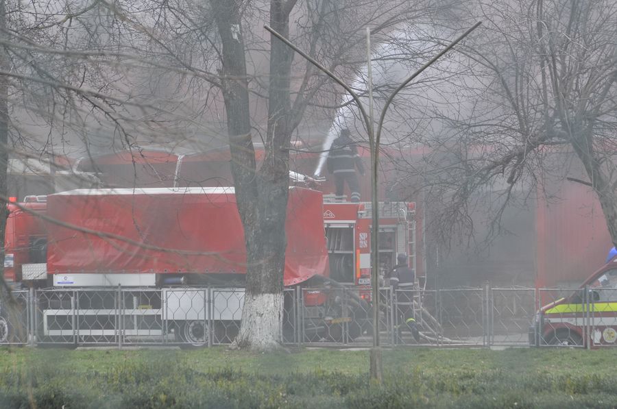 Intervenţia este dificilă din cauza degajărilor masive de fum, vizibilitatea fiind zero, dar şi a compartimentării halei, în multe spaţii.
