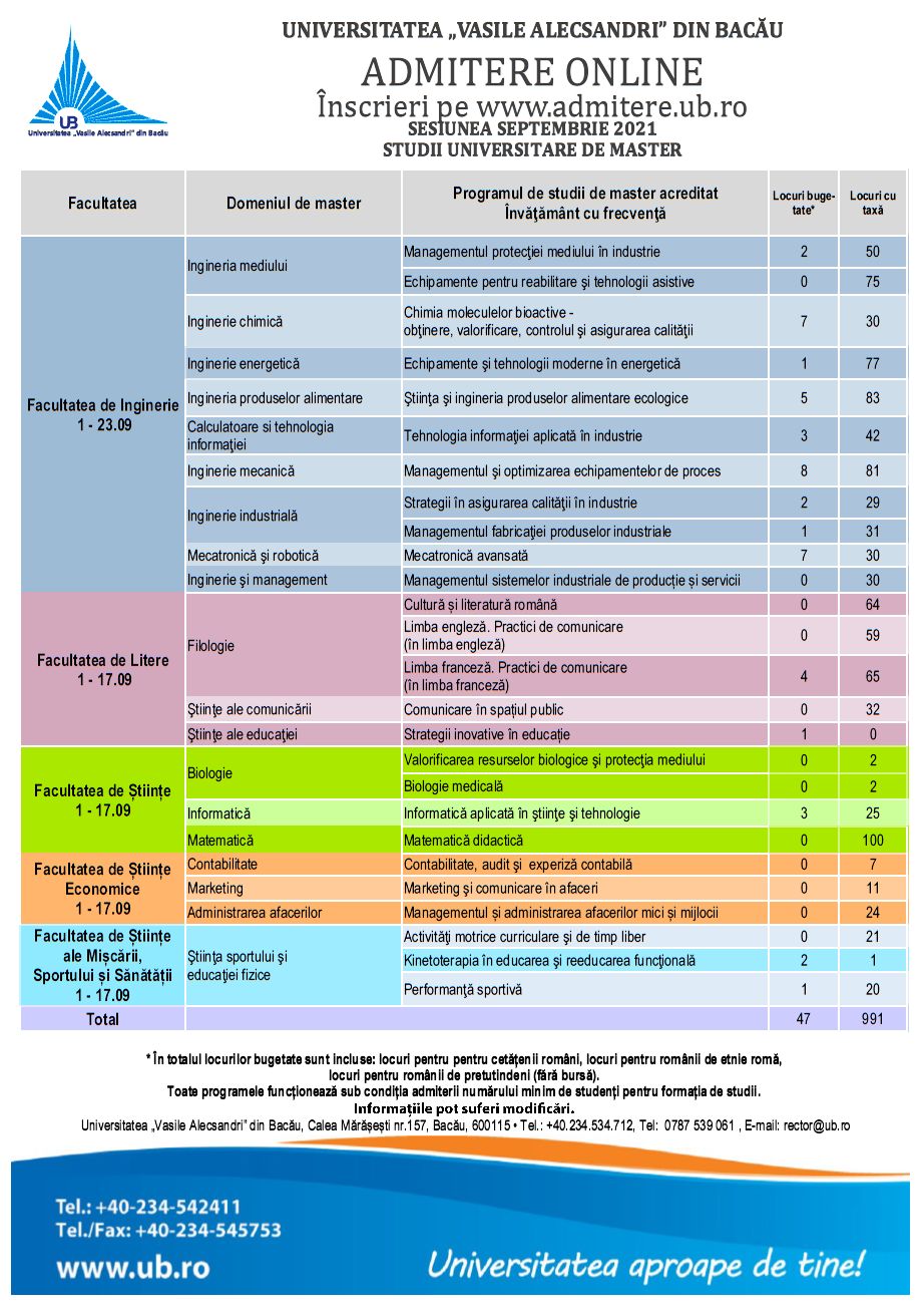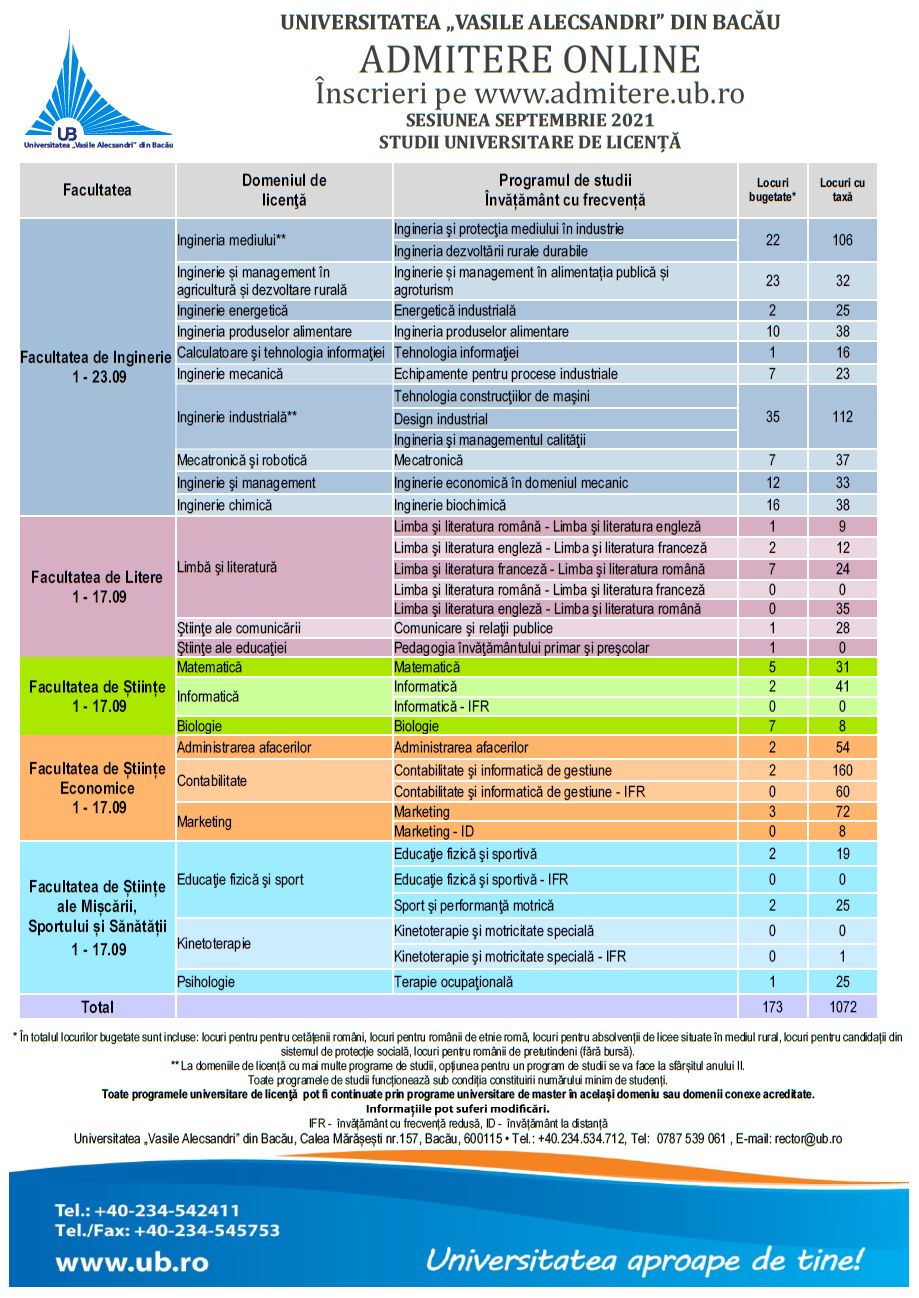Universitatea de stat „Vasile Alecsandri” din Bacău organizează a doua sesiune de admitere pentru studiile universitare de licenţă şi master la toate cele 5 facultăţi: Inginerie (1-23 septembrie 2021), Litere, Ştiinţe, Ştiinţe Economice și Ştiinţe ale Mişcării, Sportului şi Sănătăţii (1-17 septembrie 2021). Universitatea „Vasile Alecsandri” din Bacău pune la dispoziţia candidaţilor, în sesiunea de admitere de toamnă, 220 de locuri finanţate de la buget pentru licenţă şi master, care includ locuri pentru cetățenii români, pentru românii de etnie romă, absolvenţii de licee din mediul rural, candidații din sistemul de protecție socială şi românii de pretutindeni (fără bursă), precum și locuri cu taxă.