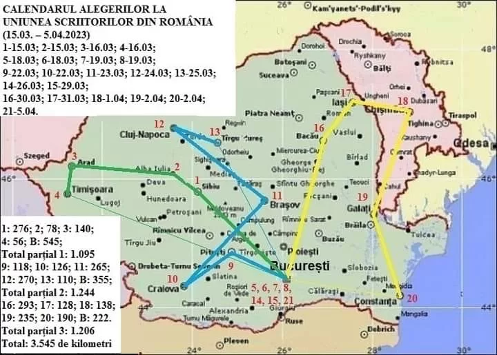 Pentru întâlnirile cu scriitorii din filiale, Doru Ciucescu va parcurge, după calculele sale, 3.545 km, pentru una și chiar două întâlniri pe zi în tot atâtea orașe. Va porni din Sibiu, apoi va ajunge în Alba, Arad, Timișoara, București, Pitești, Craiova, Brașov, Cluj, Târgu Mureș, Bacău, Iași, Chișinău, Galați și Constanța. Iar consiliul final va avea loc pe 5 aprilie.