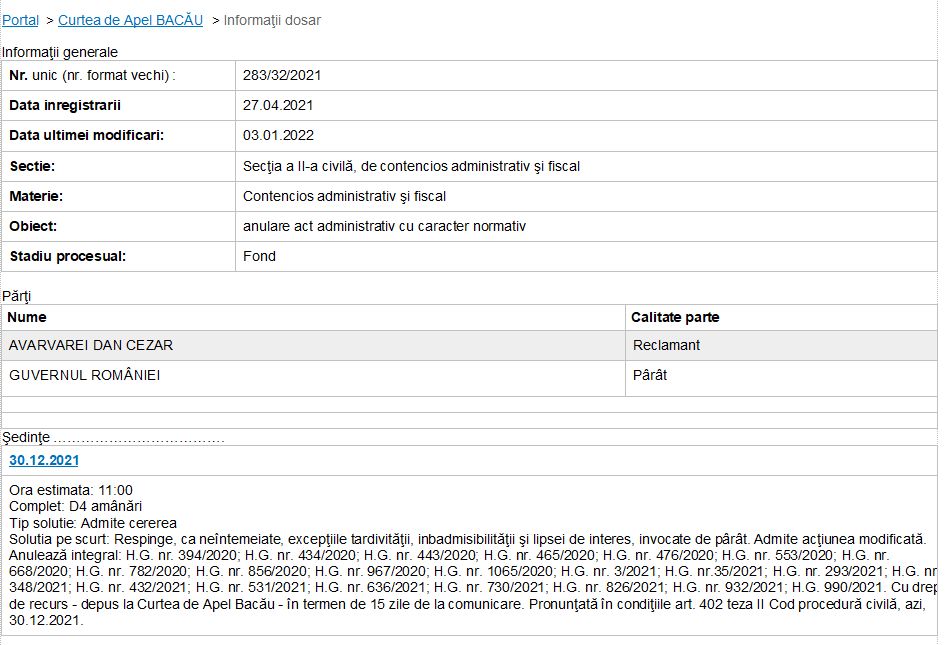 Introducerea de mai sus (neobișnuită poate) e, în fapt, o decizie publicată pe portalul Curții de Apel Bacău, instanță care, în penultima zi a anului trecut, a pronunțat soluția prin care a anulat integral toate hotărârile privitoare la starea de alertă, până la nivelul lunii octombrie 2021! (Felicităm magistrații băcăuani pentru verticalitate și curaj !!!) Curtea de Apel București a anulat la rândul său HG nr 1242/2021 ce privea prelungirea stării de alertă pe teritoriul României începând cu data de 9 decembrie 2021. Practic am încheieat anul cu anularea, în prima instanță, a tuturor Hotărârilor de Guvern prin care s-a instituit și prelungit starea de alertă, pe teritoriul României, până în prezent. Ce s-a întâmplat în acest interval de timp știm. Dacă va exista o răspundere a emitenților, vom vedea. Lucrurile se precipită pentru că și la nivel global se întâmplă lucruri neprevăzute ori minimalizate de planificatorii globali. Nu credem că simpla afirmație; ,,am executat doar un ordin” va fi suficientă pentru exonerarea de răspundere a executanților locali. Un grup de inițiativă din Marea Britanie, conform https://dailyexpose.uk/2021/12/10/uk-team-file-complaint-of-crimes-against-humanity-with-the-international-criminal-court/, a sesizat pe 6 decembrie 2021 Curtea Penală Internațională cu o plângere ,, în numele poporului ” . În sesizare se precizează că; „ pe baza amplelor revendicări și a documentației anexate, îi acuzăm pe cei responsabili pentru numeroase încălcări ale Codului de la Nürnberg, crime împotriva umanității, crime de război și crime de agresiune din Regatul Unit, dar fără a se limita la indivizii din aceste ţări”. În expunerea de motive o să observăm că în Marea Britanie s-a procedat de aceeași manieră ca și în România. Practic, a existat același modus operandi dictat la nivel internațional. Astfel, un domeniu deosebit de notabil și important, abordat în cadrul acestei plângeri documentate, este faptul că numărul cazurilor de covid-19 a fost umflat artificial din cauza inexactității și nefiabilității testării PCR. Se poate spune că, fără aceste cifre umflate, nu ar fi fost nevoie de celelalte măsuri și intervenții care sunt acum clasificate drept crime împotriva umanității. Echipa subliniază faptul că un deces covid este înregistrat dacă o persoană a murit din orice motiv în termen de 28 de zile de la un test Covid-19 pozitiv (care a fost confirmat cu testele PRC inexacte și nesigure). „Aceste decese sunt înregistrate ca fiind datorate Covid-19, indiferent dacă Covid-19 a fost sau nu cauza reală a morții.” În plus, un alt mod în care statisticile Covid-19 au fost umflate artificial este prin „rebranding-ul” gripei comune, pneumoniei și altor infecții respiratorii ca fiind de covid-19. Reclamanții au citat date oficiale care au arătat că în 2018 decesele cauzate de gripă și pneumonie s-au ridicat la 29.516, iar în 2019 au fost 26.398. Cu toate acestea, în 2020, decesele pentru gripă au fost înregistrate ca fiind doar 394 și cele cauzate de pneumonie de 13.619. În România, „rebranding-ul” a fost total. După datele INSP, în anul 2020 nu a murit nimeni de gripă sezonieră și toate decesele de pneumonie au fost asociate covid, fără nici o precizare dacă virusul a fost factorul determinant ori nu. Interdicția autopsierii a amplificat confuzia și a permis manipularea datelor. De asemenea, conform normelor atunci în vigoare, un suspect covid decedat chiar și netestat, era declarat ca fiind ,,decedat covid”. Comentând conținutul plângerii, The Expose spune; ,, De asemenea, potrivit echipei, merită o investigație completă includerea hidroxidului de grafen (în vaccinuri n.n.) și presupusa asasinare a doctorului Andreas Noack, după ce videoclipul său dezvăluia prezența acestuia în vaccinuri. Dr. Andreas explicase ce este hidroxidul de grafen și modul în care nanostructurile injectate în corpul uman acționează ca <<lame de ras>> în venele primitorilor <<vaccinului>> și că, din cauza dimensiunii structurilor, acestea nu au putut să apară în autopsii. Potrivit reclamanților, <<toxicologii>> nu-și pot imagina că există structuri care pot tăia vasele de sânge, provocându-i pe oameni să sângereze în interior până la moarte, astfel încât să nu le caute, având în vedere dimensiunea lor atomică”. Despre existența în orice formă a grafenului în vaccinuri s-a speculat foarte mult în ultima perioadă culminând cu arestarea în direct a doctorului Andreas Noack. Privind în urmă o să observăm însă că, ,,legenda conspiraționistă” a grafenului își trage seva din studii inițiate și solid finanțate încă din anul 2013. Studii despre care, public, nu se știu prea multe. Astfel, situl oficial al UE https://ec.europa.eu/commission/presscorner/detail/ro/IP_13_54 prezenta pe 28 ianuarie 2013 comunicatul de presă, plin de optimism al Comisiei Europene, denumit; Proiectele „grafenul” și „creierul uman” câștigă cel mai mare premiu de excelență în cercetare acordat vreodată, în vreme ce lupta pentru finanțarea susținută a științei continuă. Ne permitem să cităm în limita spațiului disponibil din respectivul comunicat; ,, Comisia Europeană a anunțat astăzi câștigătorii unui concurs de mai multe miliarde de euro dedicat tehnologiilor viitoare și emergente (FET). Inițiativele câștigătoare – „grafenul” și „creierul uman” – vor beneficia fiecare de un miliard de euro… Proiectul „grafenul” va explora și va utiliza proprietățile unice ale acestui material revoluționar pe bază de carbon. Grafenul este caracterizat de o combinație extraordinară de proprietăți fizice și chimice: este materialul cel mai subțire și un conducător de electricitate mult mai bun decât cuprul; de asemenea, este de 100-300 de ori