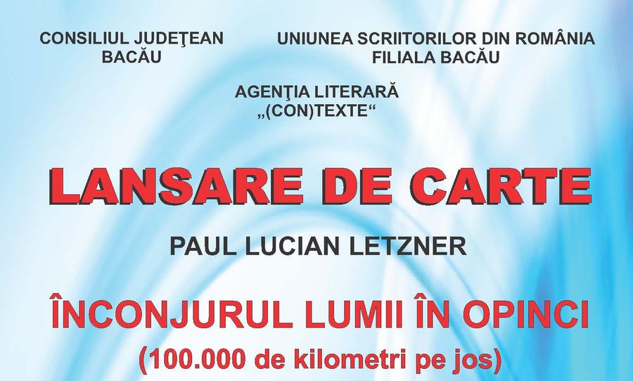 Scriitorul german cu origini românești Paul LucianLetzner își va lansa volumul „Înconjurul lumii în opinci (100 000 km pe jos)”, la Consiliul Județean Bacău (17 noiembrie 2018, ora 11) și Biblioteca „George Bacovia” Buhuși (19 noiembrie 2018, ora 12).