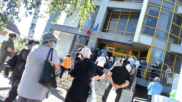 Ieri, 6 august, încă de la primele ore ale dimineții, pe scările din fața Casei Județene de Pensii (CJP) Bacău erau adunate zeci de persoane, aflate la vârsta senectuții. Cele mai multe purtau mască de protecție, aplicată în mod corect, și respectau norma de distanțare socială.