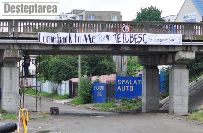 Pe podul rutier de pe strada Milcov, din Bacau, a aparut, vineri dimineata, un banner ciudat.
