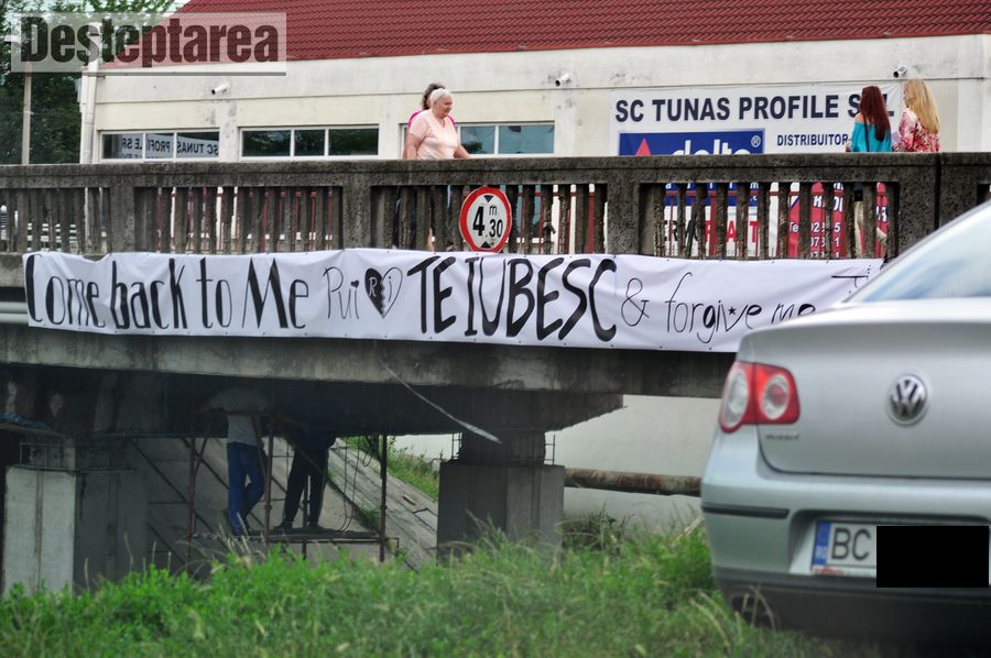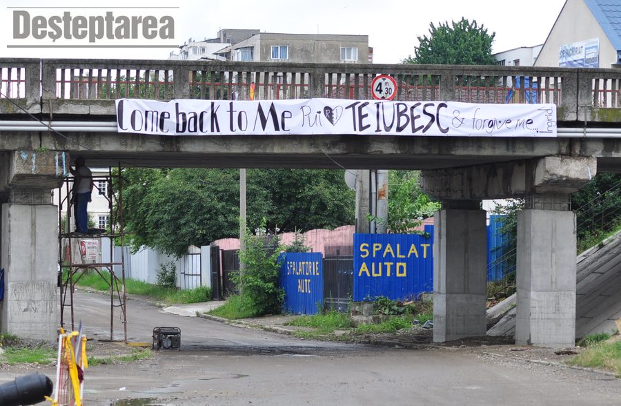 „Come back to Me Pui, Te Iubesc & forgive me. Ingrid” scrie pe banner.