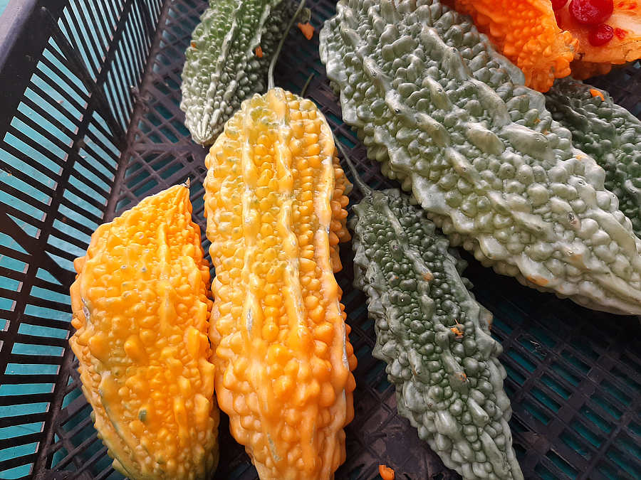 Denumiți științific momordica charantya, inediții castraveți amari provin din zona Nepalului și s-au acomodat perfect climatului de la noi. Nu au nimic în comun cu acei castraveți pe care-i punem la murat, pentru la iarnă. „Sunt folosiți mai ales de oamenii care suferă de diabet. Nu știu mai multe despre castraveții ăștia. Eu doar îi cultiv în seră, la mine, în Gioseni. Am luat de pe internet un castravete din ăsta și i-am scos semințele, după care am încercat să-i cultiv. Mai mult pentru mama mea, că și ea are diabet”, aflu de la omul de dincolo de tarabă. Îi vinde la bucată: cei mari costă 5 lei, iar cei mai mici, doar 3 lei. „Insulina vegetală”, așa cum îi numesc cunoscătorii, pot fi consumați ca atare, cruzi, dimineața, pe stomacul gol, sau uscați, sub formă de ceai. „Sunt amari ca fierea, dar…pentru cine are nevoie, asta nu e un impediment. Eu am mai luat și anul trecut, i-am și uscat și i-am pregătit pentru ceai, iarna. La farmacii, sunt mult mai scumpi”, povestește o gospodină.