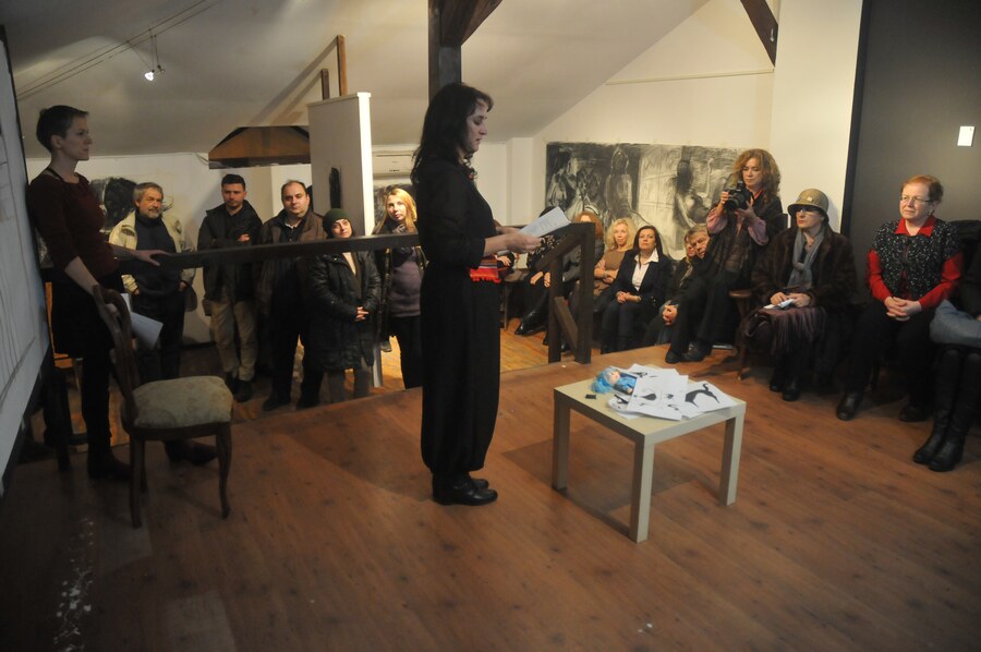 Când aproape șoptit, interiorizat, ca o incantație, cu infinită tandrețe, cu nostalgie, când pătimaș, cu furie, cu refuz, cu revoltă. Tu vorbești despre mine, eu vorbesc despre ea (un titlu parcă din filmografia lui Almodovar) s-a intitulat performance-ul imaginat de cele trei doamne, care l-au avut alături pe artistul plastic Ion Mihalache (de pe simeze ne împresoară, provocator, diferite ipostaze ale feminității, surprinse de pictor), poezia și desenul întâlnindu-se pentru a căuta, a desluși sensuri împreună. Sau, dimpotrivă, pentru a le învălui în mister.
