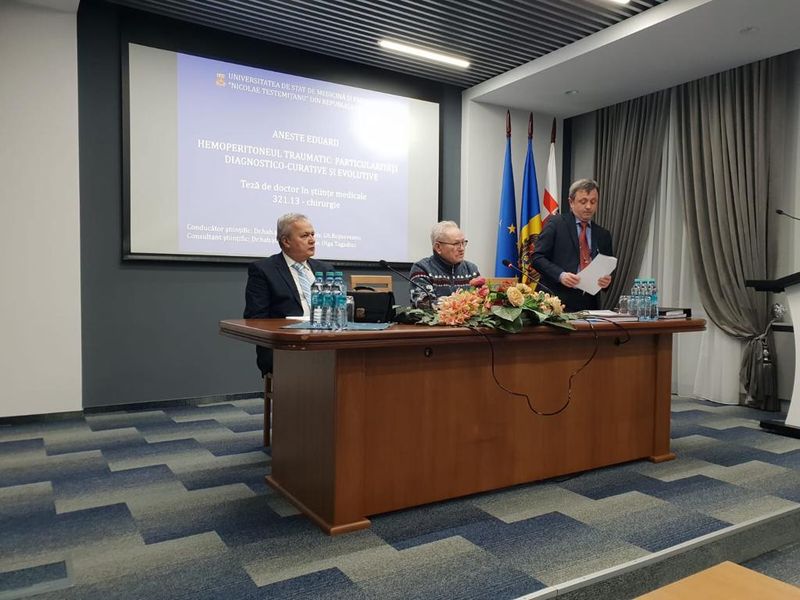 „Eu sunt membru în această comisie de doctorat a Consiliului Științific al USMF «Nicolae Testemițanu» din Chișinău – Republica Moldova, prin ordin al rectorului instituției, alături de alți patru profesori universitari din cadrul USMF Chișinău. La această susținere de teză am prezentat și eu un referat privind acea lucrare de doctorat, care a urmărit cazuistica din Spitalul Clinic de Urgență din Chișinău”, a conchis prof. univ. dr. Adrian Cotîrleț, managerul Spitalului Municipal de Urgență Moinești.