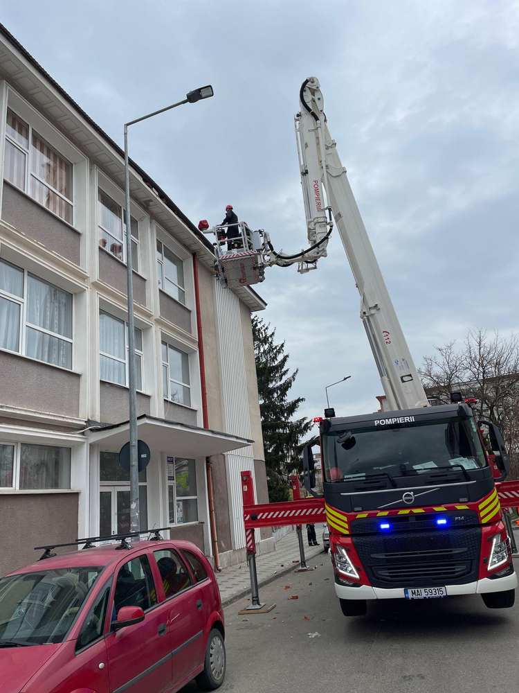 Pe durata intervenției, zona a fost delimitată, iar circulația pietonală și rutieră a fost restricționată temporar în apropierea clădirii.
