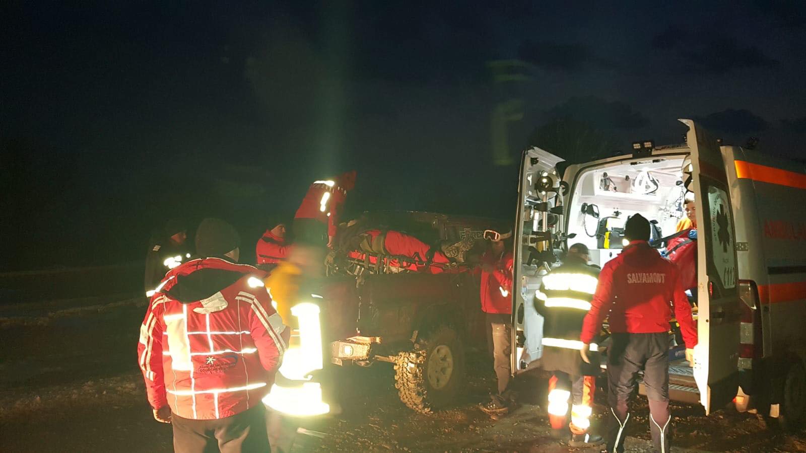 Salvatorii montani l-au stabilizat, imobilizat și transportat până la ambulanță venită în sprijin.