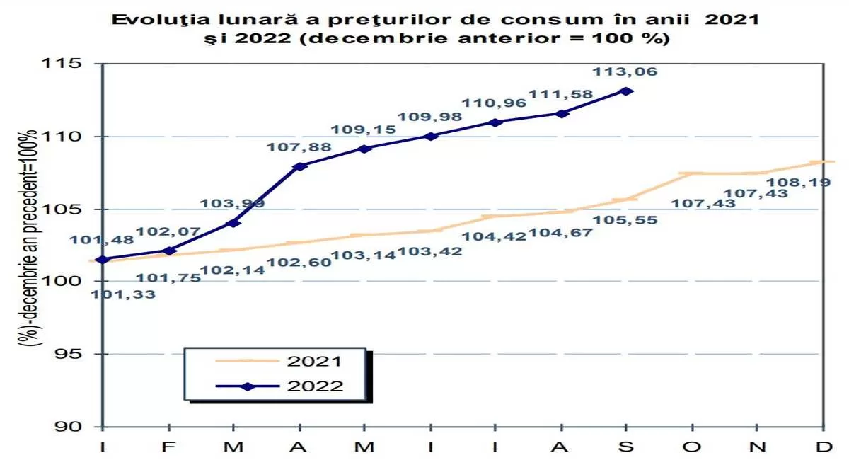 Rata medie lunară a inflaţiei în perioada 1.01 – 30.09.2022 a fost de 1,4%, valoare mai mare înregistrându-se la grupa de mărfuri alimentare (1,7%). în luna septembrie, cel mai mult au crescut prețurile la zahăr (15,33%), cartofi (9,98%), citrice (6,2%) si unt (4,15%).