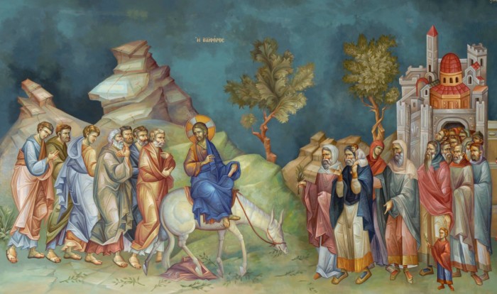 Evanghelia zilei ne fixează în pacea conținutului a trei pericope adânci. Prima (Ioan XI, 1- 45) amintește de Lazăr cel din Betania. Învierea sa, după patru zile de la moarte și după ce trupu-i fusese deja așezat în mormânt și începe a se supune legilor firii, este prima etapă a praznicului Floriilor, căci de acolo începe șirul pătimirilor Domnului. La buza unei adâncituri de peșteră omenească se deschide profunzimea ce nu poate fi nicicând imaginată: mormântul lui Dumnezeu! Ni se dezvăluie faptul că există viață și după moarte. Nu întâmplător, mireasma morții lui Lazăr e vindecată de suflarea de viață a Domnului. Cei prezenți trec din mirare în admirare. Iar admirația aceasta, purtată din glas în glas, naște zorile Intrării în Ierusalim. Celelalte două pericope evanghelice (Matei XXI, 1-11; 15-17 și Ioan XII, 1-18) ne dezvăluie cum Împăratul Vieții urcă spre Templu, dinspre cetatea Betfaghe, călare pe un mânz de asin. Pe străzile înguste ca niște nervuri, Domnul intră în Cetate. Refrenul bucuriei tuturor este cântarea Osana! Și crenguțele de finic, aprinse de focul nădejdii că tot ceea ce trăiesc este biruință. Intuiește Domnul, fără nicio îndoială, că voroavele celor ce strigă acum Osana se vor uni cu buzele sărutului lui Iuda. Nu întâmplător, între Osana și Răstignește-L pare a fi cuprinsă toată slava Intrării.