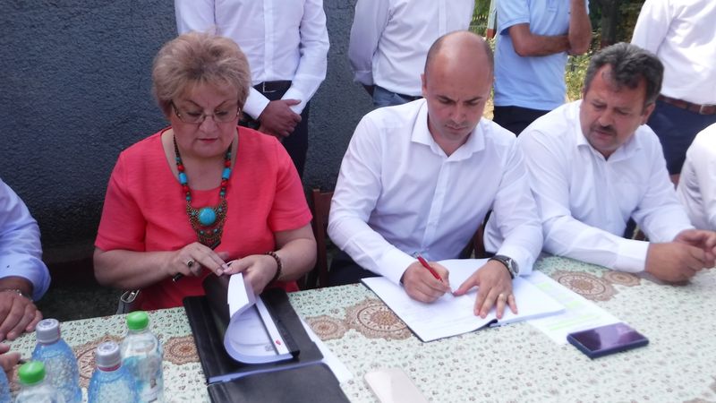 În prezenţa invitaţilor, a celor doi primari, a locuitorilor prezenţi, contractul a fost semnat de Silviu Pravăţ – vicepreşedinte al CJ, Lenuţa Ardeleanu – Direcţia Judeţeană de Drumuri şi Radu Negurici, reprezentant al grupului de firme constructoare.