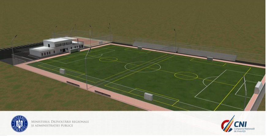 ► Teren sportiv fotbal dimensiuni omologate UEFA și FRF cu dimensiuni 105m x 68m cu nocturnă și tribune pentru 500 de spectatori