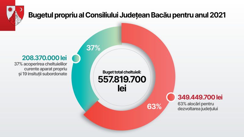 Bugetul propriu al Consiliului Județean Bacău pentru anul 2021 este prezentat, de aparatul de conducere, în grafice. Fiecare dintre ele explică exact spre ce domenii se vor duce investițiile, care sunt prioritățile investiționale și sursele de finanțare. Alocări importante sunt, în special, în infrastructura de transport și în Sănătate.