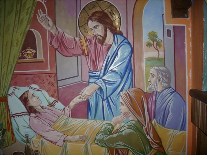 Evanghelia de astăzi ne arată încă o dată cum în atingere cu Hristos bolnavii se tămăduiesc şi morţii înviază. În vremea aceea, iată a venit un bărbat al cărui nume era Iair şi care era mai-marele sinagogii. Şi căzând la picioarele lui Iisus, îl ruga să intre în casa lui, căci avea numai o fiică „ca de doisprezece ani şi ea era pe moarte”. Înţelegem durerea tatălui şi mai mult parcă simţim tragedia când cineva îi aduce vestea năprasnică: „Nu mai necăji pe Învăţătorul căci fiica ta a murit”. Cumplit lucru pentru el, care, la fel ca toţi iudeii, avea o credinţă firavă, nelămurită, în viaţa de după moarte. Mai mult, pentru un om cu întâietatea lui, lovitura era îndoită. O dată era durerea de părinte, apoi, ruşinea și umilinţa în faţa poporului, pentru că o astfel de pierdere era privită ca o pedeapsă de la Dumnezeu. „Nu te teme, zice Iisus, crede numai şi se va mântui”. Era o zi a dragostei şi a minunilor. După acest schimb de cuvinte, Iisus şi-a continuat drumul până la casa lui Iair, unde rudele şi prietenii plângeau şi se tânguiau de această pierdere înainte de vreme şi unde începuseră deja pregătirile de înmormântare. Şi venind în casă n-a lăsat pe nimeni să intre cu El, decât numai pe Petru, Ioan, Iacov, pe tatăl copilei şi pe mamă. A luat trei dintre ucenici, cei care aveau să fie mai târziu şi martorii Schimbării la Față de pe Tabor și a luptei Sale din Grădina Ghetsimani. I-a ales pe cei mai în stare duhovniceşte de a pătrunde şi purta taina Puterii şi a Fiinţei Sale. Aceştia trei aveau să vadă cea dintâi înviere din morţi săvârşită de Domnul şi să le spună celorlalţi nouă ca să se înveţe astfel ucenicii să aibă încredere unul în altul. Intrând în casă, Domnul s-a îngrijit de cei ce plângeau şi jeleau copila care murise. Apoi le-a zis: „Nu plângeţi; n-a murit, ci doarme”. Şi râdeau de El, ştiind că a murit. Matei şi Marcu lărgesc tabloul. Erau acolo cântăreţi şi bocitori tocmiţi în împrejurimi, după obicei, acelaşi şi la iudei şi la păgâni. Era tulburare și plângeau şi se tulburau mult (Marcu 5, 38). Iair era un om de vază, poate cel mai de vază, din acel ţinut. În afară de cântăreţii şi bocitorii plătiţi, trebuie să se fi adunat acolo o mulţime de rude, prieteni și vecini care plângeau din toată inima după copila dusă aşa de timpuriu. Iisus trecu cu vederea această lipsă de cuviinţă rezultată din neîncrederea în puterea Lui dumnezeiască şi în chemarea Lui înaltă şi apucând mâna celei adormite strigă: „Copilă deşteaptă-te!”. „S-a întors duhul ei şi a înviat îndată” (Luca VIII, 50-51).