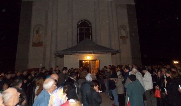 Fix la miezul noptii, luminile din biserica s-au stins, iar imediat preotul paroh Ioan Vadana a iesit din altar cu lumina sfânta a Invierii, pe care a impartit-o celor prezenti. A urmat o scurta slujba religioasa la finalul careia preotul le-a vestit enoriasilor ca “Hristos a inviat!”.