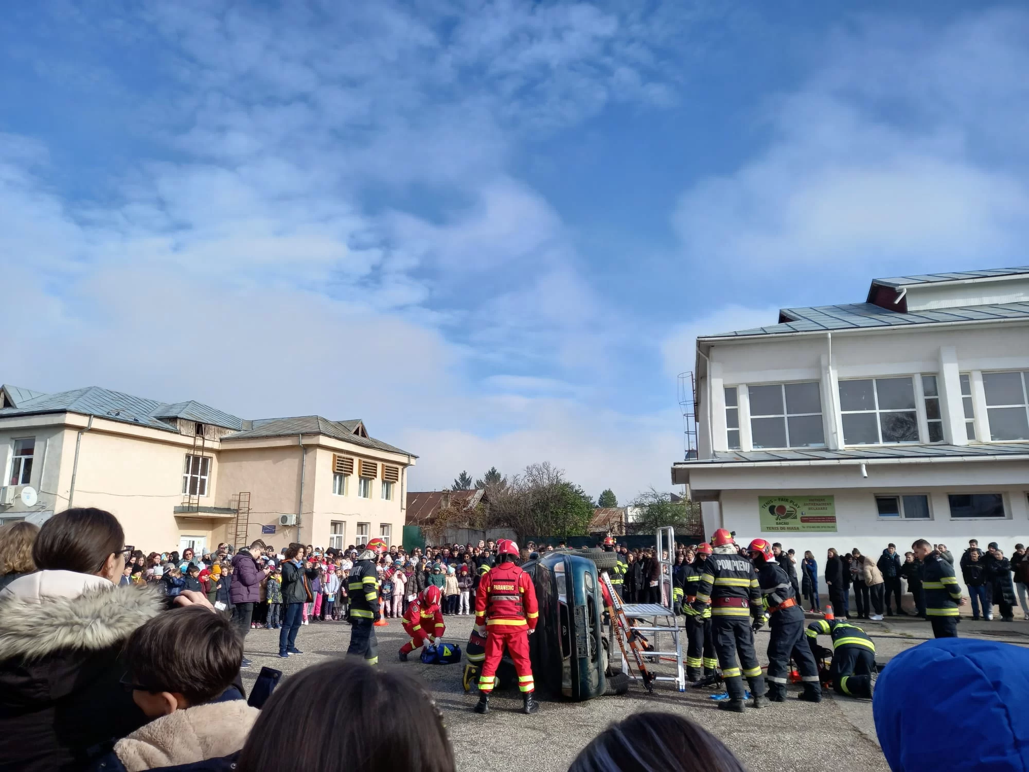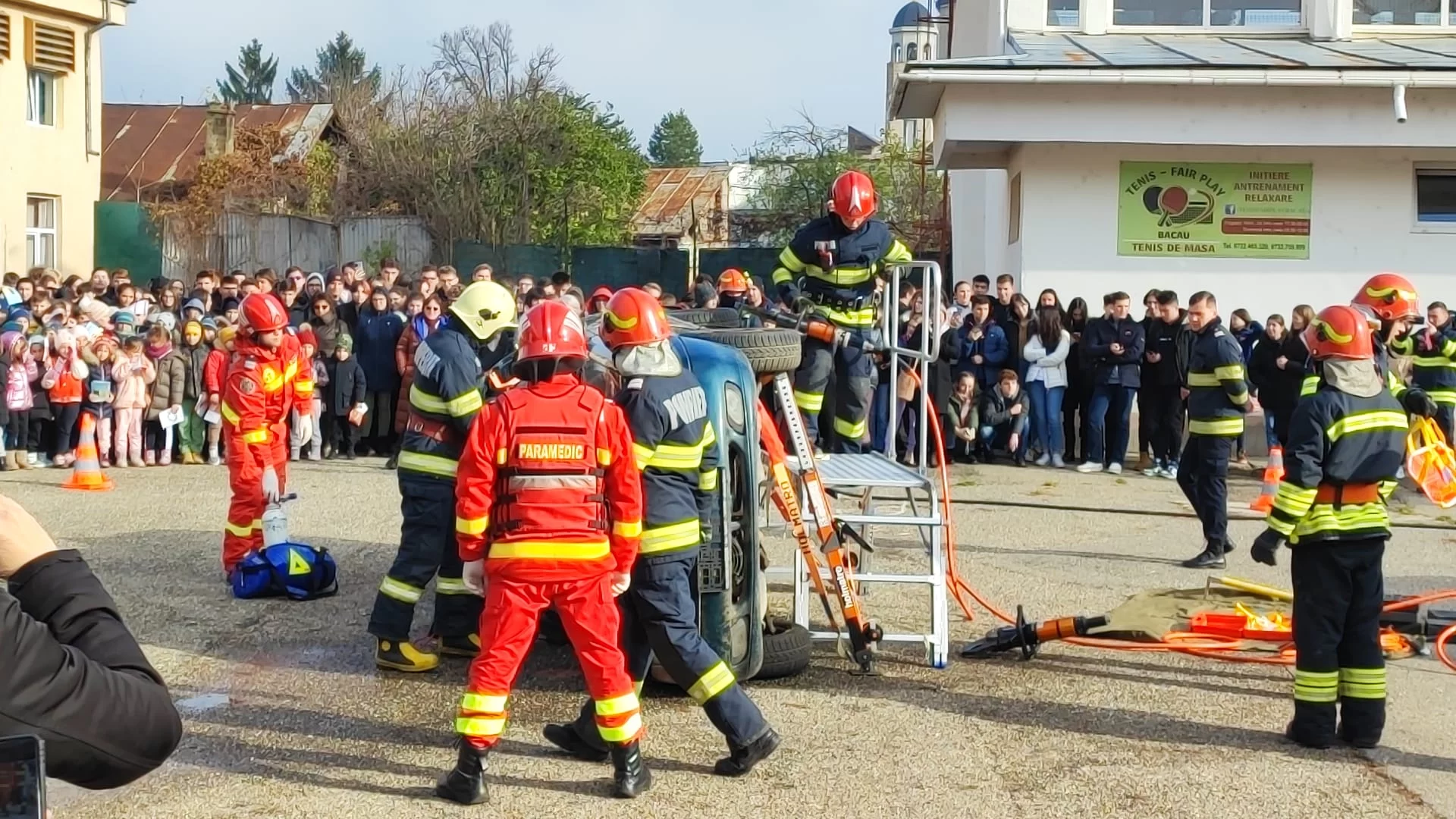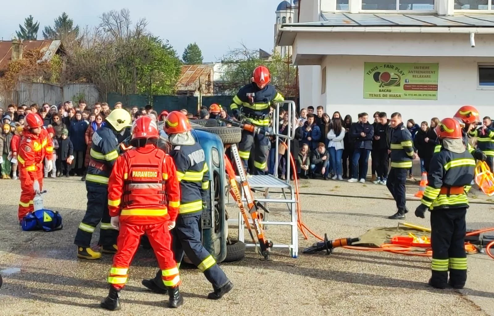 Exercițiul a început cu declanșarea alarmei de incendiu și evacuarea tuturor elevilor, moment urmat de cunoscutele proceduri ce se aplică în astfel de situații în școli. În ordine, elevii au fost conduși de către profesori și învățători către locul unde urma să se desfășoare demonstrația pompierilor în caz de accident. Pentru o simulare cât mai fidelă a realității, a fost adusă o mașină răsturnată în care era plasat „rănitul”. După sosirea mașinii de pompieri, reprezentanții ISU Bacău au început prin a fixa vehiculul pentru a se asigura că se păstrează poziția inițială a victimei. Protejând persoana în cauză de cioburi, a fost spart parbrizul și geamul portierei deschise. În final a fost introdus în interior tubul de oxigen și tăiat tavanul mașinii pentru o extragere fără riscuri a rănitului de către paramedici.