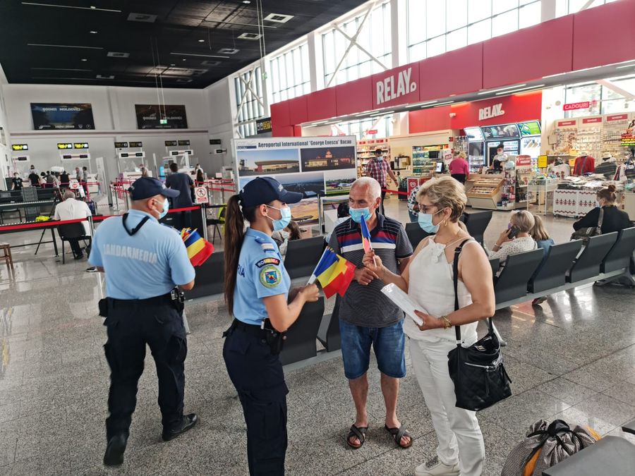 Tot astăzi, jandarmii băcăuani au fost prezenți în mijlocul cetățenilor la porțile de îmbarcare ale Aeroportului Internațional „George Enescu” Bacău, unde au împărțit stegulețe tricolore, urând celor care urmau să părăsească teritoriul românesc: „La mulţi ani români, de Ziua Drapelului Național, oriunde v-aţi afla!”