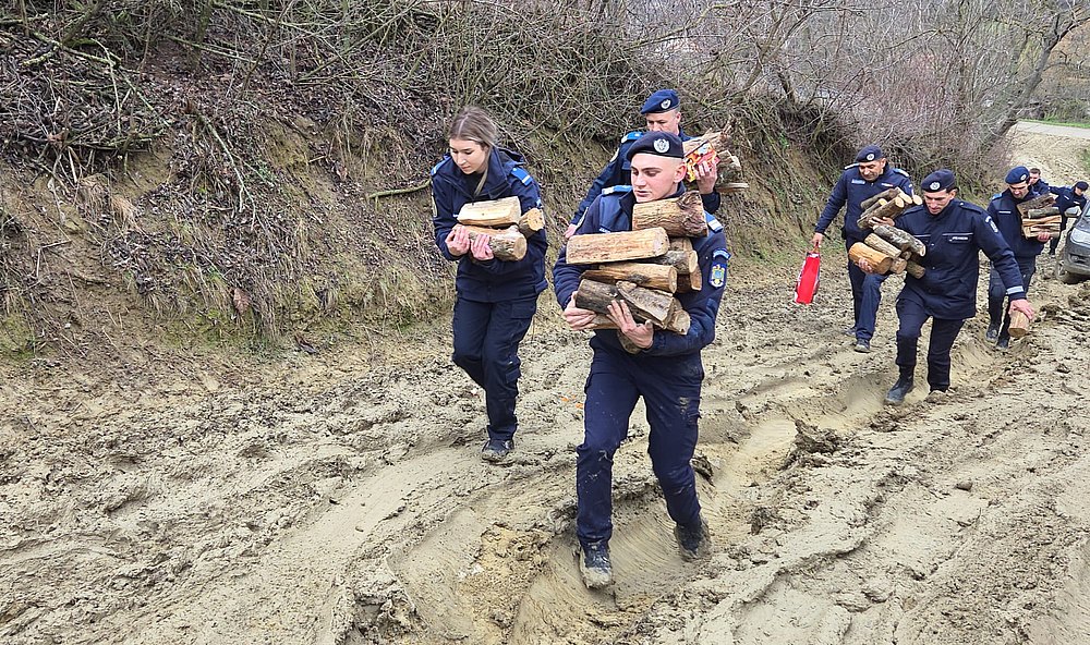 Zilele trecute însă, tăcerea i-a fost spartă de pașii unor oameni care au venit nu în uniforma rigorii, ci în hainele omenirii. O patrulă de jandarmi băcăuani a urcat pe jos până la gospodăria bătrânului, după ce drumul îngust și noroios le-a refuzat accesul cu autospeciala. Au mers încărcați nu doar cu lemne, ci și cu intenția sinceră de a face bine.