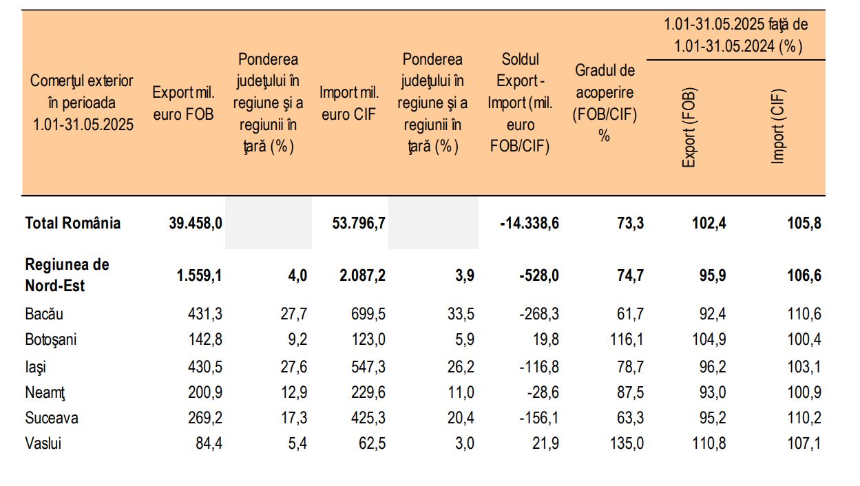 În acest context, Nord-Estul contribuie cu doar 4% din exporturile țării și 3,9% din importuri – un nivel modest, dar semnificativ pentru economia regiunii. Deficitul regional ajunge la 528 de milioane de euro, cu o acoperire de 74,7%, mai bună decât media națională.