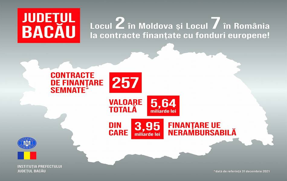Conform datelor statistice furnizate de către Ministerul Investițiilor și Proiectelor Europene, Județul Bacău continuă să se numere printre județele fruntașe în ceea ce privește atragerea de fonduri europene.