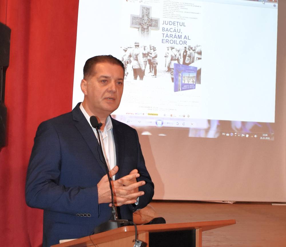 Prof. dr. Alin Sebastian Popa: „Avem speranța că vom deveni mai responsabili față de patrimoniul eroic inestimabil al județului Bacău, că împreună vom reuși să identificăm cele mai eficiente modalități de promovare ale acestuia și, nu în ultimul rând, că astfel vom deveni mai conștienți că România Mare a fost clădită, în bună măsură, pe fundamentul solid al celor 100.000 de militari înhumați în pământul județului Bacău – cel mai mare osuar al eroilor din România.”