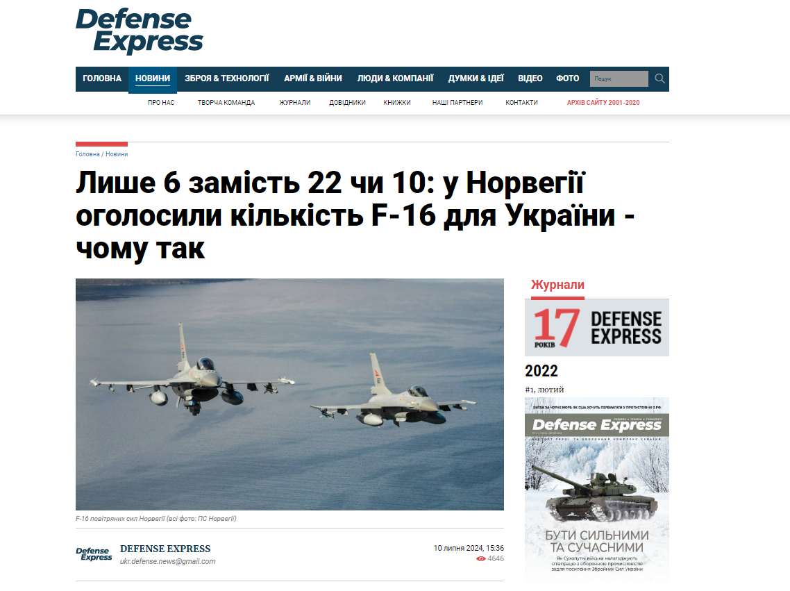 „Faptul că din cele 22 de avioane F-16 presupuse disponibile în Norvegia doar șase sunt în stare de luptă și încă două sunt utile doar pentru antrenament este, desigur, problematic. Aceste aeronave au fost scoase din serviciu acum doi ani, iar din 2022, oficial, Norvegia avea 57 de unități. Dintre acestea, 32 au fost cumpărate de România în urma unor negocieri care au durat aproape un an, până în noiembrie 2022. Bucureștiul a selectat imediat cele mai bune și mai proaspete aeronave disponibile,” a declarat un oficial ucrainean.