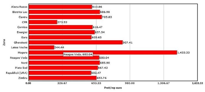 La categoria „apartamente cu patru camere” prețurile merg de la 548 de euro (în Neagoe Vodă) la 662 euro pe mp (în Centru). Dar în Alecu Russo s-a ajuns la 619 euro, în Bistrița Lac la 652, în Energiei la 661, în comuna Nicolae Bălcescu la 548, în Nord la 568, în Piața Sud la 623, în Republicii (Aerostar) la 551, iar în zona Zimbru la 595 euro pe mp.