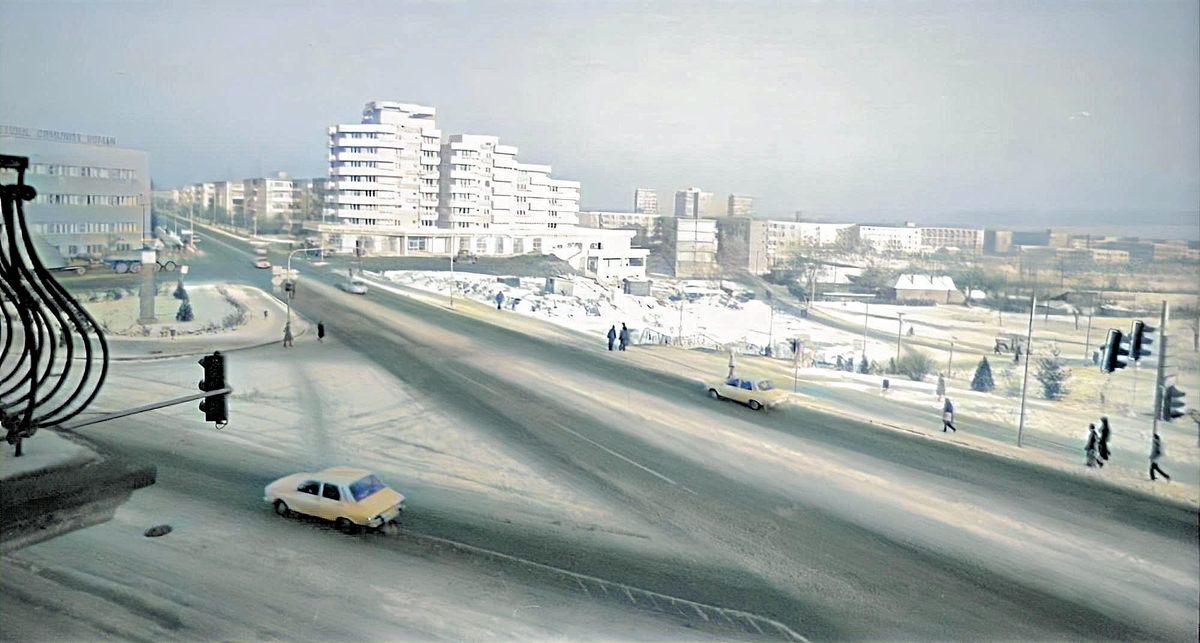Clădirile moderne cu arhitectură tipică anilor ’70-’80 domină peisajul urban. În dreapta, se zărește valea unde, la acea vreme, Casa Albastră era doar un proiect pe hârtie. În fundal, blocurile masive arată expansiunea orașului în perioada socialistă. Lipsa aglomerației sugerează o zi obișnuită, poate o dimineață de iarnă geroasă.