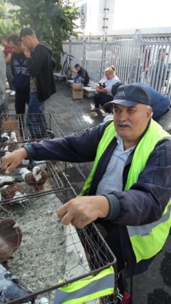 De obicei aici e zarvă mare duminica, dar ieri, din cauza vremii capricioase, au fost mult mai puțini vânzători, dar și cumpărători. Cei care vin cu păsări, pești de acvariu și alte animăluțe de ogradă sunt prezenți în fiecare duminică dimineață. Pentru a putea să stea cu „marfa” la vânzare plătesc la Vivariu o taxă de 8 lei. Între ei, oameni și oameni. Unii se feresc atunci când văd camera de fotografiat de parcă i-ar căuta Interpolul. Alții sunt destul de vocali și plini de „miștocării”. Au simțul umorului, deși uneori e puțin deplasat. Ne interesăm de marfă. „În afară de porci și viței găsești cam de toate”, ne spune un vânzător de porumbei. E mare pasionat. Are porumbei de toate felurile și de toate culorile. „O parte dintre cei pe care-i vedeți aici suntem pasionați de păsări. Le creștem cum scrie la carte. Facem artă din asta. Dar uite la doamnele alea… vând găini și pui de găină cumpărați de la ferme care produc. N-au nicio treabă cu pasiunea pentru păsări”, mai spune omul pe un ton de necaz. Zice că nu prea merge treaba, că oamenii nu mai cumpără ca altă dată. Alături, un tip mai tânăr, vinde și el tot porumbei. Îi crește acasă, în cartierul Gherăiești: „Am moștenit pasiunea pentru porumbei de la bunicul meu care avea foarte mulți. Cred că pe la șapte ani am început să îndrăgesc porumbeii și de atunci…”, povestește tânărul columbofil, fără a ne da și alte detalii. Nimeni nu vrea să spună mai multe și toți îl recomandă pe nea’ Mustață, el fiind cel mai în vârstă crescător și vânzător de porumbei din piață.