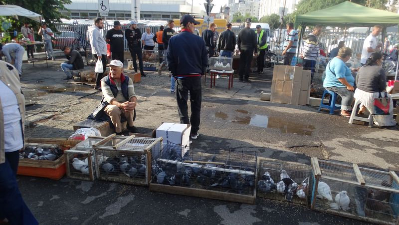 De obicei aici e zarvă mare duminica, dar ieri, din cauza vremii capricioase, au fost mult mai puțini vânzători, dar și cumpărători. Cei care vin cu păsări, pești de acvariu și alte animăluțe de ogradă sunt prezenți în fiecare duminică dimineață. Pentru a putea să stea cu „marfa” la vânzare plătesc la Vivariu o taxă de 8 lei. Între ei, oameni și oameni. Unii se feresc atunci când văd camera de fotografiat de parcă i-ar căuta Interpolul. Alții sunt destul de vocali și plini de „miștocării”. Au simțul umorului, deși uneori e puțin deplasat. Ne interesăm de marfă. „În afară de porci și viței găsești cam de toate”, ne spune un vânzător de porumbei. E mare pasionat. Are porumbei de toate felurile și de toate culorile. „O parte dintre cei pe care-i vedeți aici suntem pasionați de păsări. Le creștem cum scrie la carte. Facem artă din asta. Dar uite la doamnele alea… vând găini și pui de găină cumpărați de la ferme care produc. N-au nicio treabă cu pasiunea pentru păsări”, mai spune omul pe un ton de necaz. Zice că nu prea merge treaba, că oamenii nu mai cumpără ca altă dată. Alături, un tip mai tânăr, vinde și el tot porumbei. Îi crește acasă, în cartierul Gherăiești: „Am moștenit pasiunea pentru porumbei de la bunicul meu care avea foarte mulți. Cred că pe la șapte ani am început să îndrăgesc porumbeii și de atunci…”, povestește tânărul columbofil, fără a ne da și alte detalii. Nimeni nu vrea să spună mai multe și toți îl recomandă pe nea’ Mustață, el fiind cel mai în vârstă crescător și vânzător de porumbei din piață.