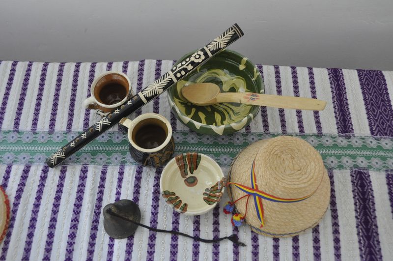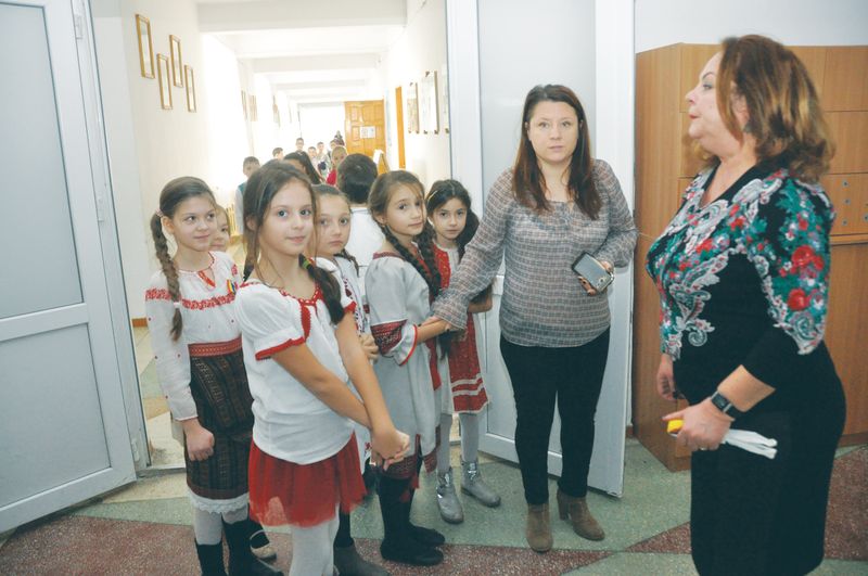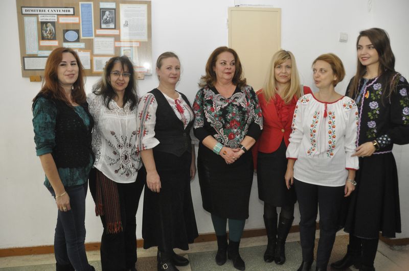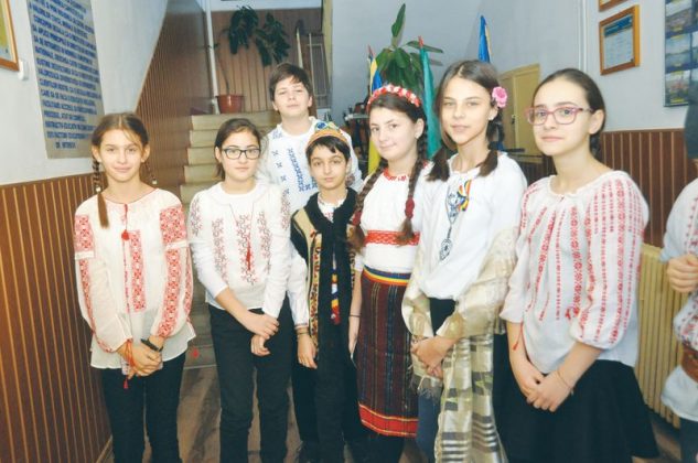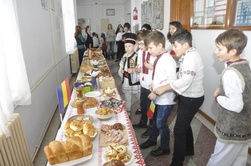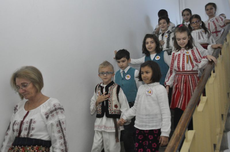 Pe un alt hol, o expozitie de obiecte traditionale – ulcele, linguri de lemn, farfurii de lut, clopote de fier, chiar si o casca din razboi. In toata unitatea de invatamânt, in clase si pe scarile interioare, o defilare a unei frumoase parade a costumelor populare. Va urma si un concurs de istorie. E pauza mare. Veselie, joc si o atmosfera pur româneasca.