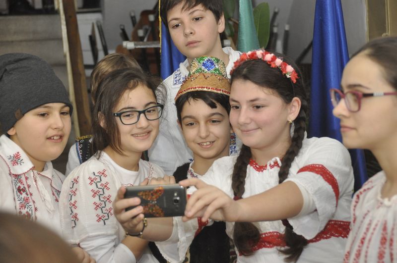Elevi imbracati in portul traditional, cu bundite si opinci, codite impletite la fetite, caciuli cu ciucuri la baietei, catrinte si ii multicolore. Si, peste tot, bucuria de a trai cu adevarat aceste momente, alaturi de profesorii indrumatori.
