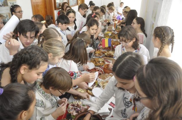 Marti, ora 09.45, Scoala Gimnaziala „Spiru Haret” Bacau. Pe unul dintre holuri, undeva la etajul I, produse traditionale românesti – sarmale, cârnati, sunca cu ceapa si usturoi, cozonac si placinte poale-n brâu, cornulete si pâine de casa.