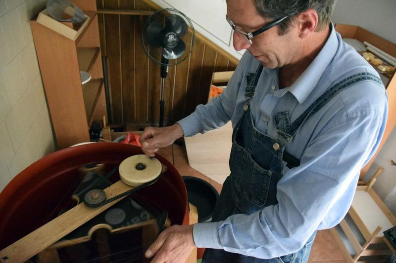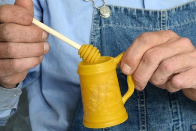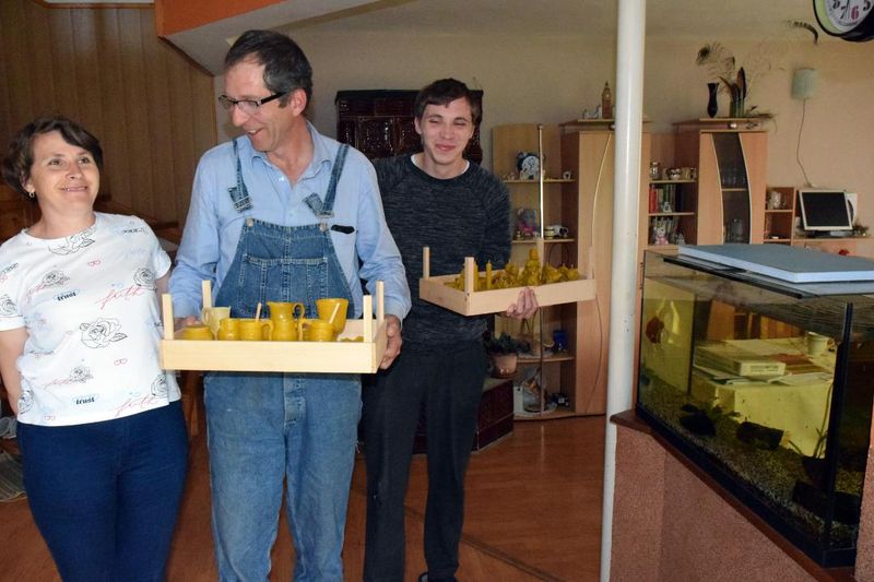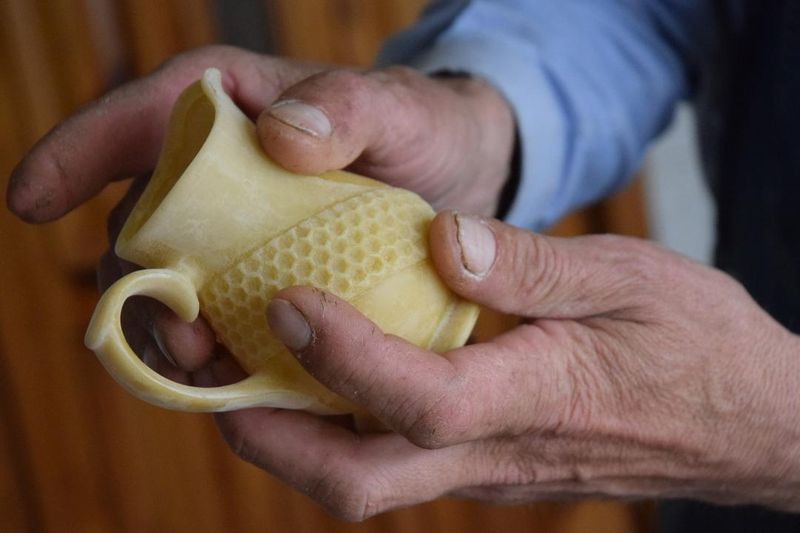 „Pitici și lumânări face toată lumea, din parafină. Cum recunoști ceara naturală? Una că e lipicioasă. Apoi mirosul! În timp, face o brumă pe ea. Bruma cerii se numește. Când ai dat cu palma pe ea, rămâne un luciu pe urmă. Dacă stă la soare, se albește. În magazine sunt rafturi cu borcane de miere, din sticlă, cu etichete de tot felul. Atunci mi-a venit ideea! Miere adevărată, în borcănașe și capac tot din ceară. Acolo trebuie să stea! Sau turnată în mici carafe, cu bețigașul pentru degustare, tot din ceară! Asta se întâmpla în august, 2018.”. Poți să pui în ele polen, propolis. Multă migală, dar se merită. Se păstrează în mediul lor natural. La unele modele, interiorul trebuie scobit manual. La turnat în forme, soția și mama îl ajută.