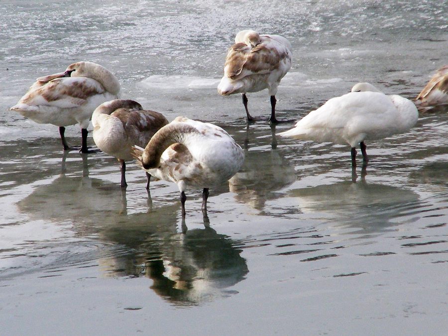 Ele nu se scufunda. Basculeaza cât le permite ciocul si gâtul. Deversarile zilnice din baraj sparg gheata, oferind conditii prielnice atât de hrana cât si de adapost. De aici si numarul lor din ce in ce mai mare.