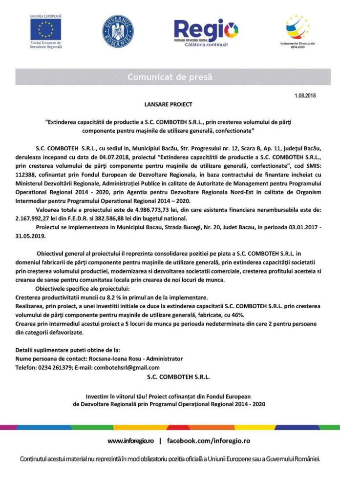 „Extinderea capacității de producție a S.C.COMBOTEH S.R.L., prin creșterea volumului de părți componente pentru mașinile de utilizare generală, confecționate”