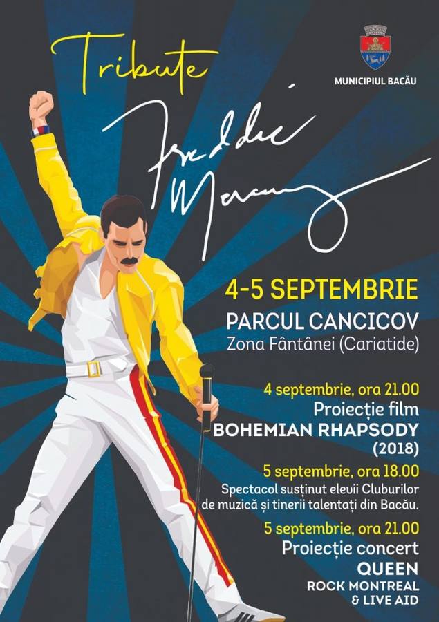 Astfel, sâmbătă, 4 septembrie, va avea loc proiecţia filmului ,,Bohemian Rhapsody” (2018), iar duminică, 5 septembrie, de ziua artistului, elevi şi tineri talentaţi vor susţine un spectacol inedit, urmat de proiecţia concertelor Queen, de la Rock Montreal (1981) şi Live Aid (1985).