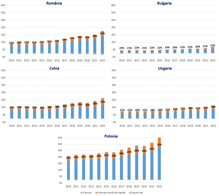 O primă observație care se poate formula este aceea că România ocupă o poziție de mijloc în clasamentul regional din perspectiva contribuției investițiilor (formării brute de capital) la formarea PIB. Astfel, în perioada 2019 – 2022, în România investițiile au avut o pondere în PIB de circa 24% – 27%, superioară Poloniei și Bulgariei, dar semnificativ mai redusă decât în Ungaria (28% – 34%) sau Cehia (28% – 32%).