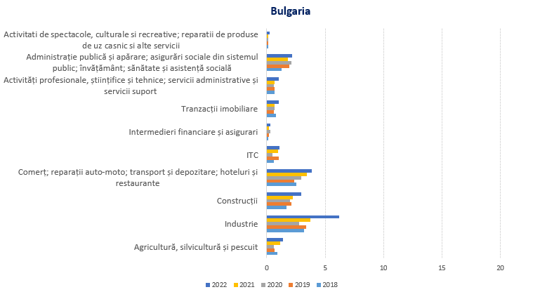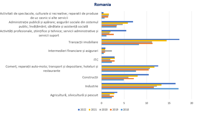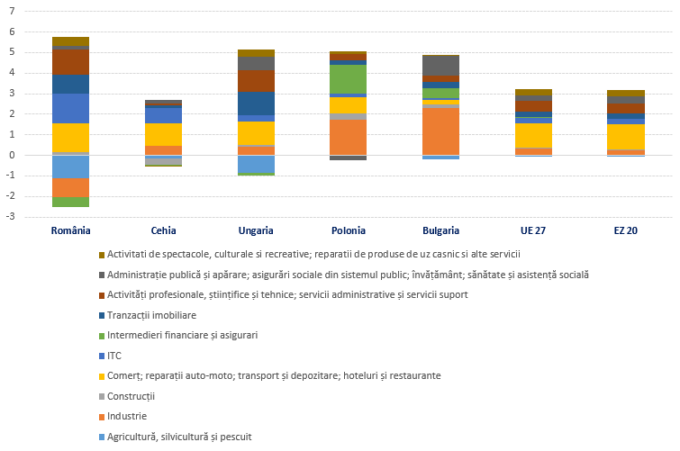 - În cazul sectorului construcțiilor și cel de IT&C, contribuția la VAB este mai ridicată în România, atât comparativ cu regiunea, cât și la nivel european. Diferențele sunt însă de circa 1 – 2 puncte procentuale. Așadar, investițiile în acest sector, mai mari comparativ cu regiunea, nu par a produce deocamdată o diferențiere favorabilă semnificativă pentru România, din perspectiva contribuției la VAB.