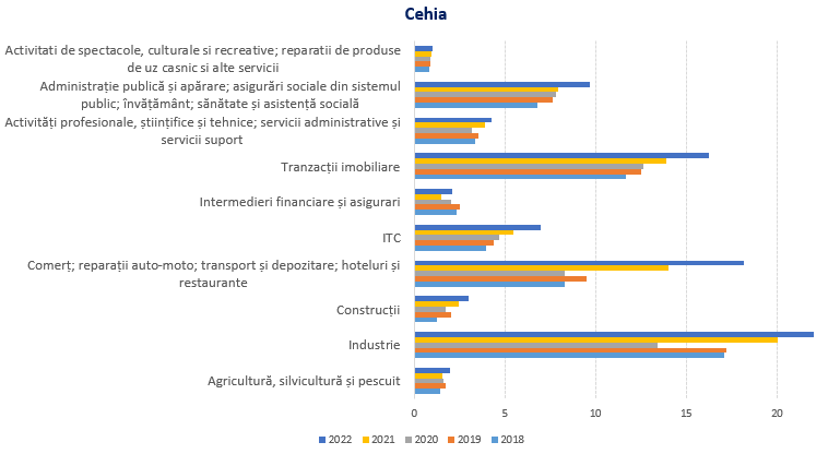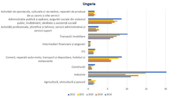- pe ansamblul serviciilor grupate în categoriile comerț, transport, depozitare, reparații auto-moto, hoteluri și restaurante, România s-a plasat peste Ungaria, dar a fost depășită semnificativ de Cehia în anii 2021 și 2022, cei mai recenți pentru care există date complete.