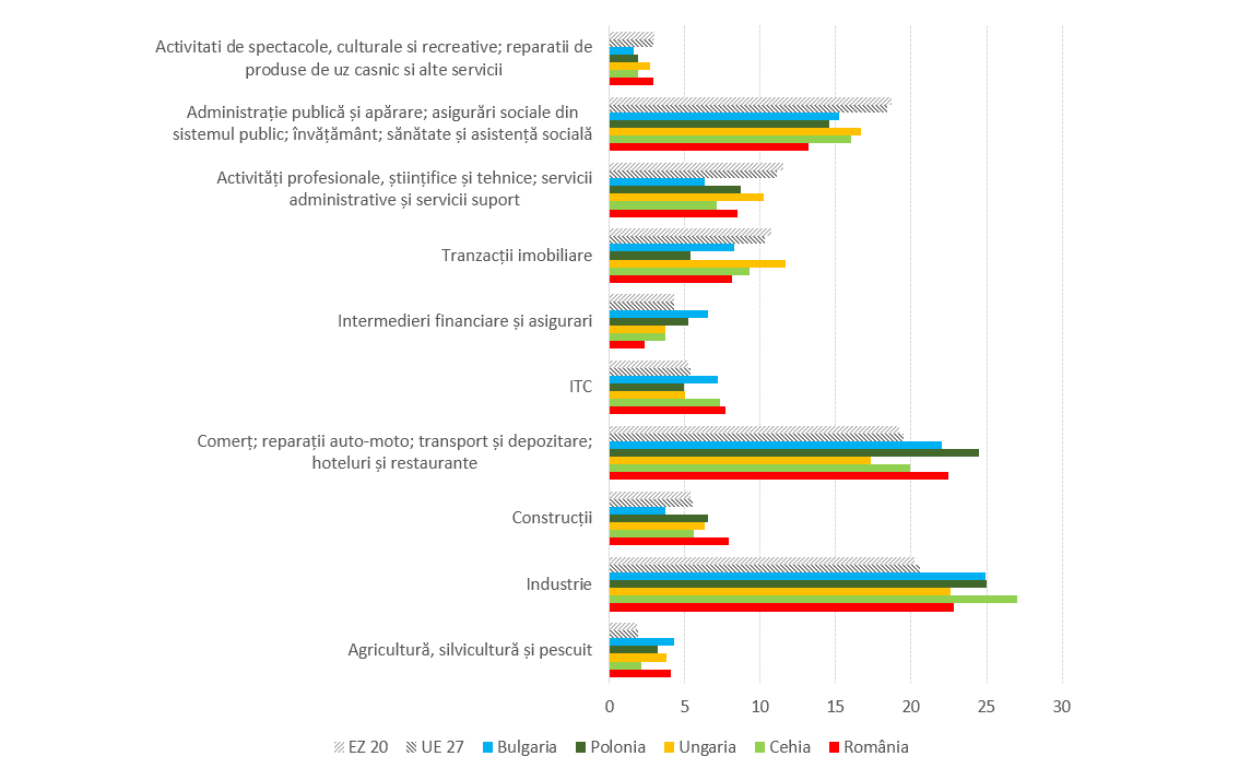 - Contribuția industriei la VAB este mai mare față de media EU și a zonei Euro, atât în România, cât și în Bulgaria, Cehia și Polonia, țări care ne și surclasează din această perspectivă. În Ungaria, situația este foarte apropiată de a noastră.