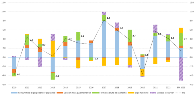 Al doilea aspect este că, încetinirea consumului în primele trei trimestre ale anului 2023 a fost contracarată parțial de aportul favorabil al exporturilor nete (pentru prima dată în ultimii aproximativ 10 ani) și într-o măsură importantă de investiții. Deși benefic și îmbucurător, aportul exporturilor nete este însă posibil să nu poată fi menținut în perioada următoare, pentru că există transformări importante la nivel global care deocamdată acționează cu multă forță în sens nefavorabil schimburilor internaționale (tensiuni geopolitice, reamplificarea protecționismului, încetinire economică în Europa și în China etc). Așadar trebuie să putem conta în continuare pe revenirea consumului. În același timp, investițiile sunt necesare pentru adaptarea economiei la noile condiții și pentru implementarea avansului tehnologic foarte accelerat din ultimii ani. Mai mult, ele sunt susținute de importante programe de finanțare la nivel european. Așadar avem motivații foarte puternice pentru a realiza toate eforturile necesare astfel încât, după performanța foarte bună a investițiilor din primele trei trimestre ale anului trecut, acestea să nu încetinească semnificativ în anul 2024.