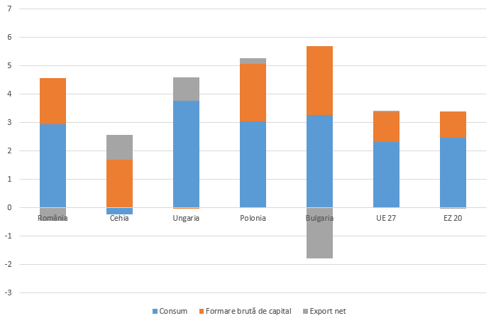 Pentru a completa imaginea de mai sus, este important de avut în vedere că, la nivelul Uniunii Europene (27 de state) și al zonei Euro (20 de state), ponderea formării brute de capital în PIB s-a situat în intervalul de timp menționat între 23% și 25%, iar cea a exporturilor nete între 2% și 4%.