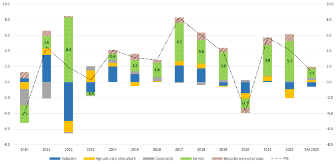 Crizele suprapuse, numeroasele blocaje la nivel internațional și volatilitatea piețelor de materii prime au făcut ca participarea industriei la creșterea economică să fie în cazul României predominant negativă în perioada 2019 – 2022 și inclusiv în primele trei trimestre ale anului 2023.