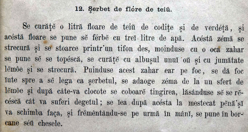 Din căpșuni și fragi sirop, dulceață. Dudele pătează cămașa. Însă cele mai utilizate, de noi toți, sunt florile de tei. Ceaiul face minuni cu efectele lui tonifiant-calmante. Băi, comprese. Dar știați că din flori de tei, bunicii noștri făceau și șerbet? Așa era moda. Era servit în chisea, alături de un pahar cu apă de izvor, în care plutea un fir de „mentă rece”, verde. Vă ofer spre delectare, încă o rețetă veche.