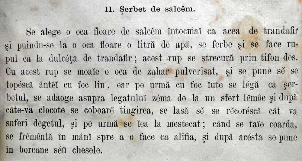 Rachiul din flori de salcâm este mai puțin utilizat la noi. Doar în nordul Moldovei și Dobrogea. Cine a fost în Deltă, i-a simțit parfumul și tăria. Secretul l-am aflat de la un lipovean. Pentru prepararea lui nu se folosește doar floarea, ca să dea aroma, ci și coaja salcâmului, pusă la macerat. De acolo ies gradele. Lemnul este folosit pentru realizarea butoiașelor, care dau și culoare conținutului. Ca și la dud, nimic nu se pierde. Cum nu avem alambic la bloc, cu toate că mai fac unii alcool, în oale sub presiune adaptate pentru aragaz, cu gazul plătit la paușal, propun altceva. O rețetă veche, salvată dintr-o carte de bucate, tipărită pe vremea străbunicii: Șerbet din flori de salcâm.